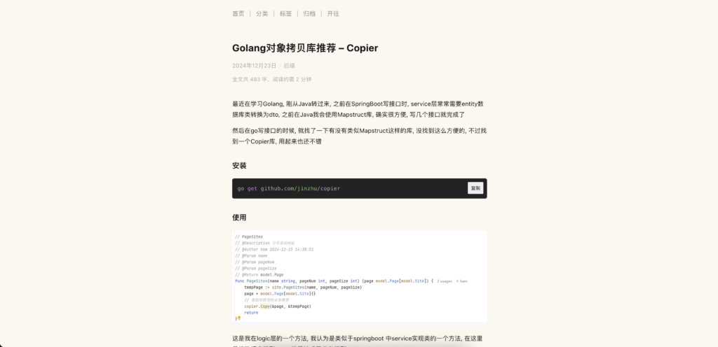 2024年12月23日 Golang对象拷贝库推荐 – Copier 最近在学习Golang, 之前在SpringBoot写接口时, service层常常需要entity数据库类转换为dto, 之前在Java我会使用Mapstruct库, 确实很方便, 写几个接口就完成了 然后在go写接口的时候, 就找了一下有没有类似Mapstruct这样的库, 没找到这么方便的, 不过找到一个Copier库, 用起来也还不错 安装 go get github.c... 阅读约需 2 分钟·后端 查看更多 →